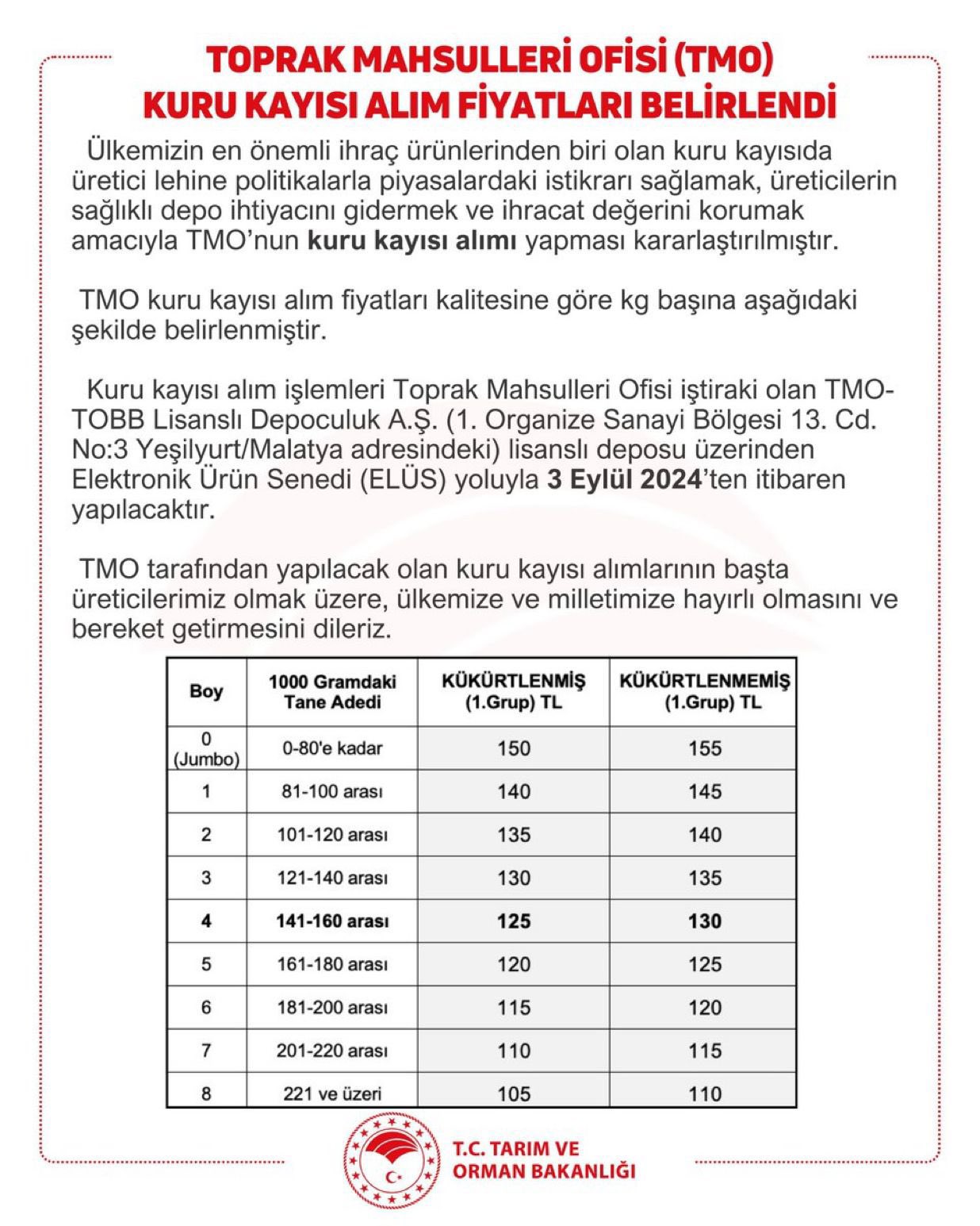 Toprak Mahsülleri Ofisi (TMO) 03.09.2024 tarihi itibari ile kuru kayısı alımına başlıyacaktır.