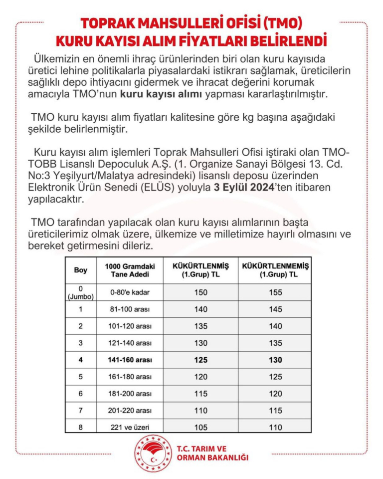 Toprak Mahsülleri Ofisi (TMO) 03.09.2024 tarihi itibari ile kuru kayısı alımına başlıyacağını duyurmuştur.